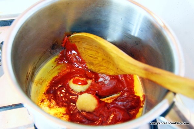 2. Make seasoning saucePut 2 teaspoons of vegetable oil, ⅓ cup of gochujang (hot pepper paste) and 2 teaspoons of minced garlic and sauté in a pot on low heat for 3 min. Stir frequently. |