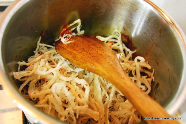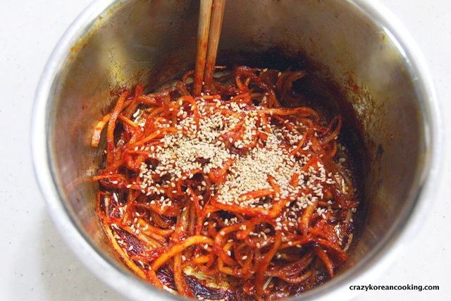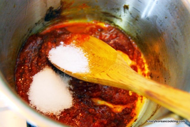 3. Finish seasoning sauceAdd 3 teaspoons of sugar and 1 teaspoon of mulyeot (Korean malt syrup). Sauté for 1 min. And turn off the heat. |