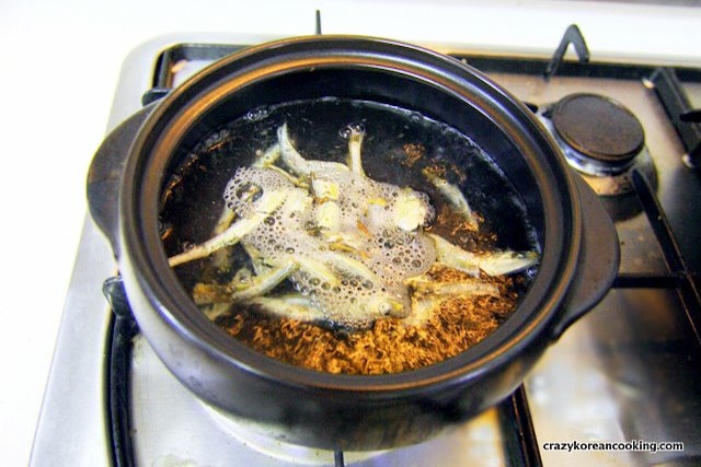 Boil 3 cups of water in a pot. Put 20 heads of anchovy and 1 piece of 5cm by 5cm kelp (optional) into boiling water. Let it boil on high heat for 15 min. Remove the anchovies and kelp. If you use an anchovy mesh, you can just remove the mesh at the end.