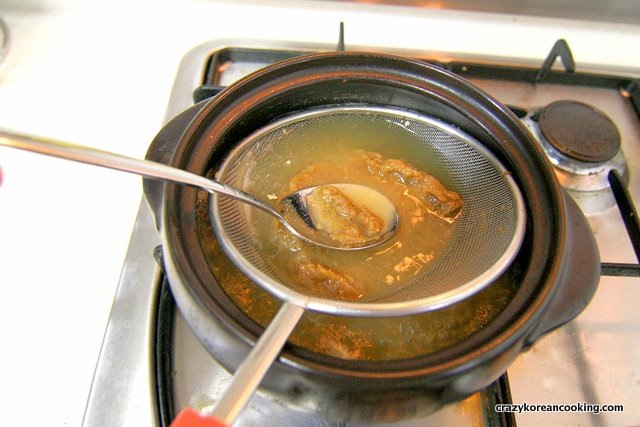Dissolve 3 tablespoons of soybean paste into the broth. Let it boil for 3 min on medium heat and add 1 teaspoon of red chili flakes (optional), 2 teaspoons of minced garlic and radish. Keep boiling until the radish is cooked