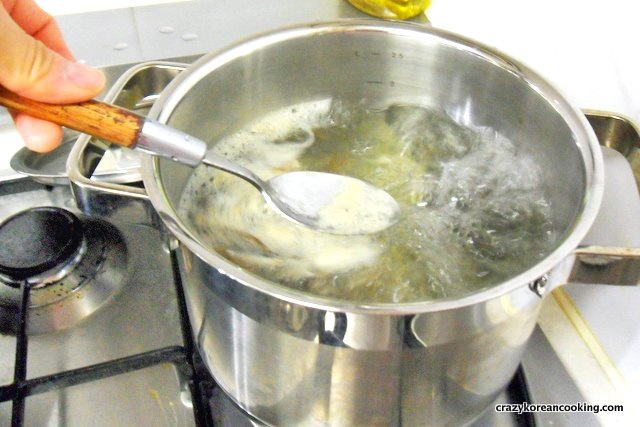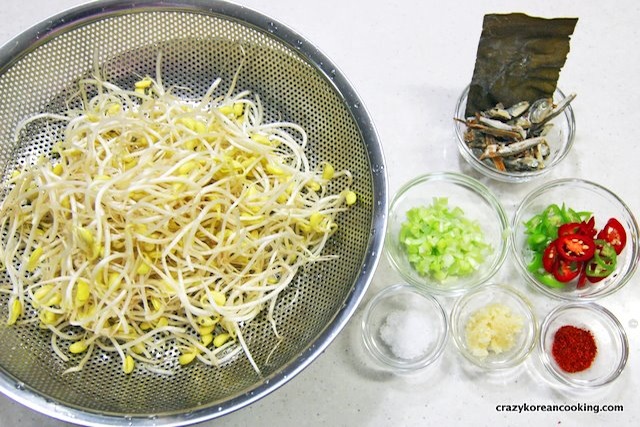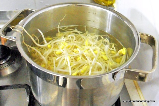 4. Soybean SproutsAdd 200g of soybean sprouts into the anchovy broth. Boil with a lid on high heat for 10 min. It’s important to boil soybean sprouts with a lid. Otherwise it can result in a slightly unpleasant smell. |