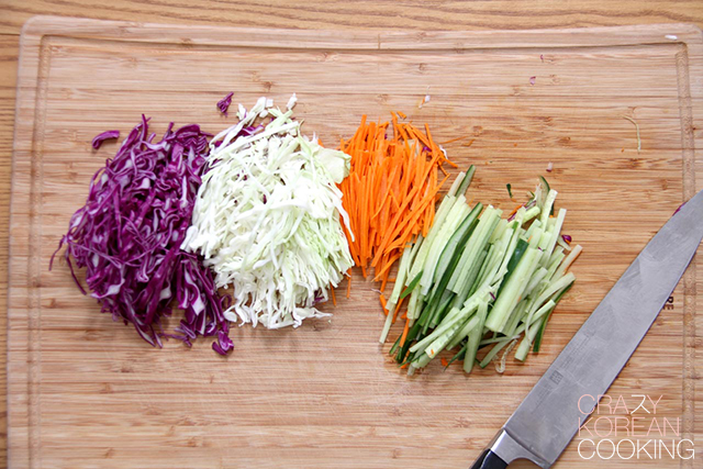 3. Prepare VegetablesWash, peel and julienne ½ cucumber and 2 oz (50g) of carrot. Wash and julienne 7 oz (200g) of cabbage. Wash and drain 1.7oz (50g) of crown daisy (optional). |