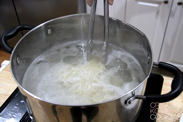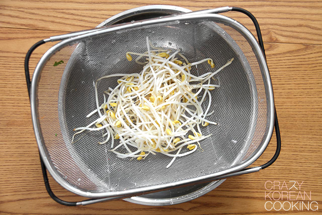 4. Prepare Soybean sproutsWash 5.3oz (150g) of soybean sprouts twice in cold water. Drain well. Add 1 tablespoon of salt and the bean sprouts in a pot of boiling water. Cover the pot and cook on high heat for 3 minutes. Rinse in cold water and drain completely. Set aside. |