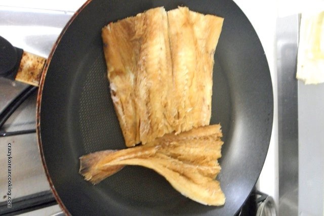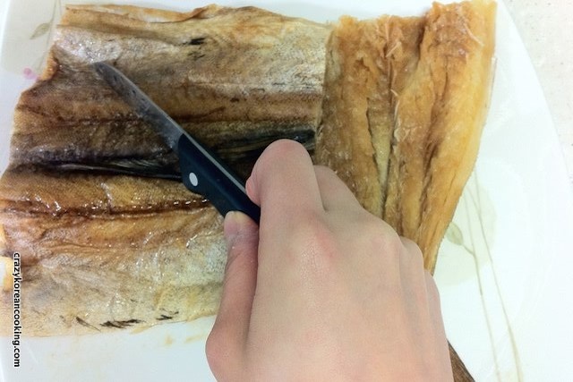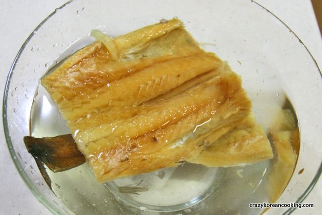 1. Prepare fishRemove the head, tail and fins from the dried pollack and cut it in half (or into bite sized pieces). Then soak it in water for 15 min. (Soaking time may be varied based on pollack’s dryness). |