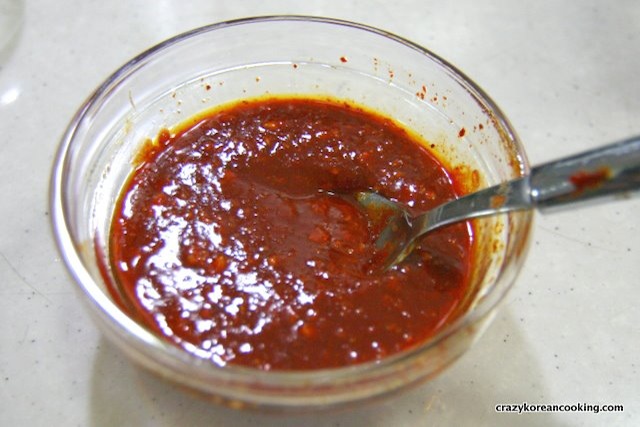 7. SeasonMix all the seasoning ingredients (1 tablespoon of gochujang, ½ tablespoon of gochugaru (red chili pepper flakes), 1 tablespoon of maesil syrup (optional), 1 tablespoon of sugar, ½ tablespoon of malt syrup, 1 tablespoon of sesame oil, ½ tablespoon of vegetable oil, 1½ tablespoons of minced garlic and ½ teaspoon of minced ginger). |