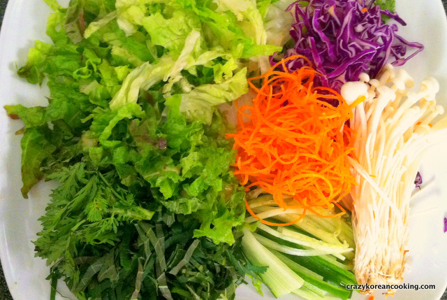 3. Wash & Cut vegetablesWash vegetables and remove all the moisture using a clean kitchen towel or paper towel. Cut all vegetables into julienne. For sesame leaves, roll the leaves then cut into thick strips |