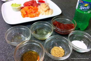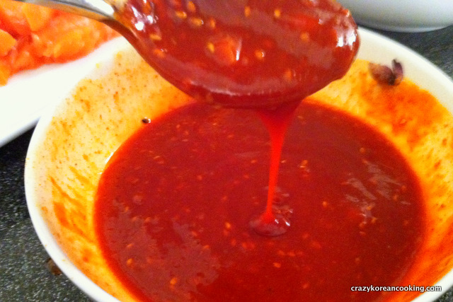 4. Make sauceFor the sauce, mix Gochujang, vinegar, sugar, Sprite, sesame oil, sesame seeds, and malt syrup (Mul-Yut) in a small bowl. |