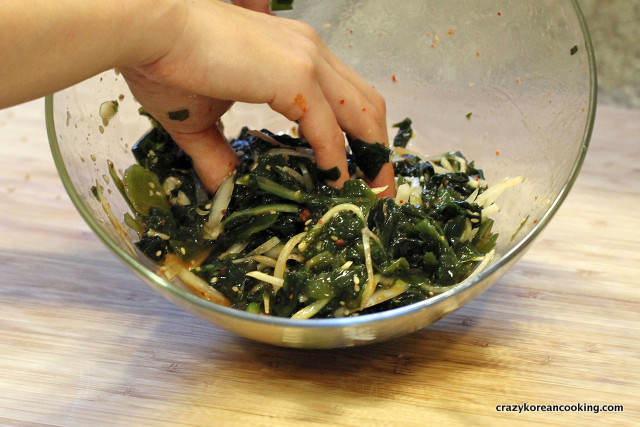 9. Make seasoningIn a bowl, mix ½ teaspoon of minced garlic, ½ teaspoon of salt, 2 tablespoons of vinegar, 4 teaspoons of sugar, ½ teaspoon of gukganjang (or regular soy sauce), 1 teaspoon of gochujang (red chili paste), ½ teaspoon of gochugaru (red chili flakes) and 2 teaspoon of sesame seeds. |