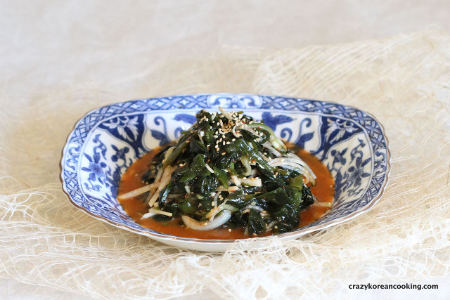 Miyeok muchim (seaweed salad) is great when you are craving for something refreshing that will boost your appetite. A perfect trio: soft miyeok, crunchy radish and succulent cucumber, dressed with a sweet and sour vinaigrette is indeed invigorating to your taste buds. Miyeok muchim is traditionally served as one of the side dishes that complement rice for any meals but it can surely be a great appetizer as well. This recipe is a spicy version.