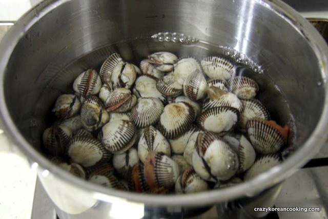 2. BoilPlace the cleaned cockles in a pot and add 4 cups of water and 6 tablespoons of rice wine. Boil it on high heat until the cockles (about 6-7) start to open up. (Do not wait until all the cockles open up! They will be overcooked.) |
