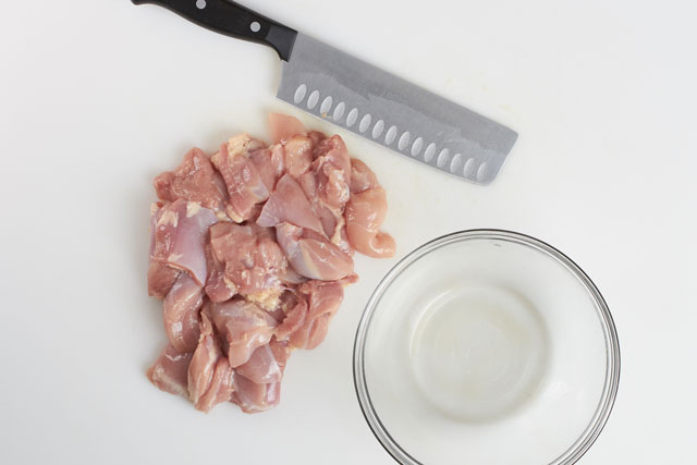 1. Cut chickenIf the chicken is thick, slice thinly (about 3/8” to ¼” thickness). Cut into roughly 3” squares. They don’t have to be square shaped as long as the area is about that size. |